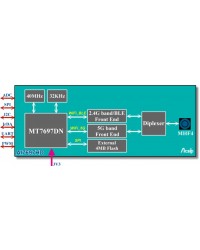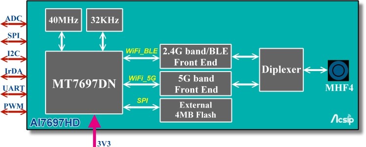 AI7697HD is a highly integrated SIP module which features an application processor, a low power 1x1 11n Dual-band Wi-Fi subsystem, a Bluetooth subsystem, and a Power Management Unit. The application processor subsystem contains an ARM Cortex-M4F MCU, which has many peripherals, including UART, I2C, SPI, I2S, PWM, IrDA, and auxiliary ADC. AI7697HD also includes embedded SRAM/ROM and an external 4MB serial flash.